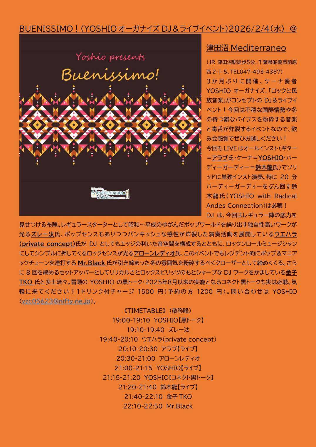 - 2/11(水)越谷 Easy Goings(埼玉県): YOSHIO with Radical Andes Connection